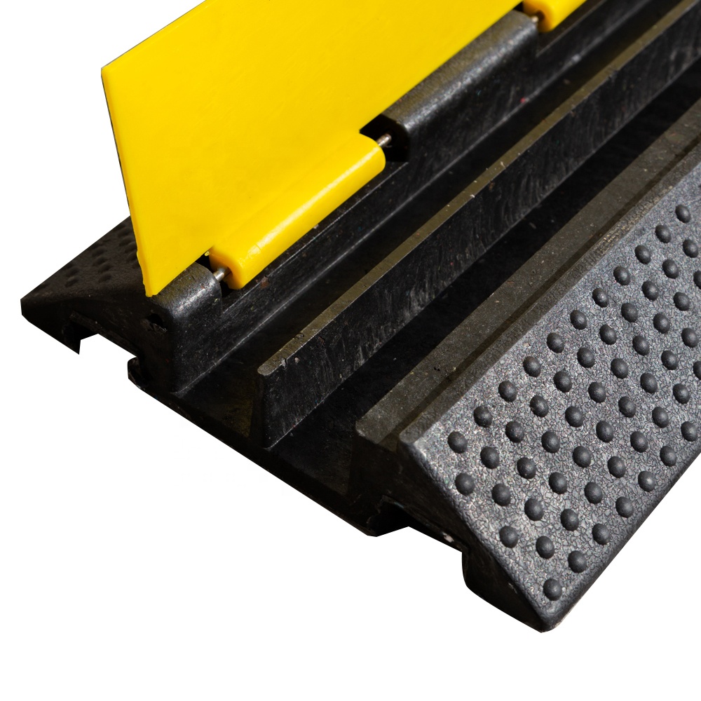 It is usually being placing at the passage of the factory, parking lot, exhibition centre, performing-arts centre, stadium or concerts, especially those places which cars often pass by. This cable protector can easily hide those cables and prevent them being exposed outside, meanwhile, it protects cables from being crashed or pressed. It's incredible insulativity can withstand 2500V voltage. The bright yellow safety lid with warning symbols can easily attract people's attention.