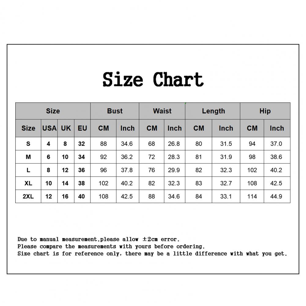 Size Details: : Size: S, Length: 80cm/31.5", Bust: 88cm/34.6", Waist: 68cm/26.8", Hip: 94cm/37" (Approx.) Size: M, Length: 81cm/31.9", Bust: 92cm/36.2", Waist: 72cm/28.3", Hip: 98cm/38.6" (Approx.) Size: L, Length: 82cm/32.3", Bust: 96cm/37.8", Waist: 76cm/29.9", Hip: 102cm/40.2" (Approx.) Size: XL, Length: 83cm/32.7", Bust: 102cm/40.2", Waist: 82cm/32.3", Hip: 108cm/42.5" (Approx.) Size: 2XL, Length: 84cm/33.1", Bust: 108cm/42.5", Waist: 88cm/34.6", Hip: 114cm/44.9" (Approx.)