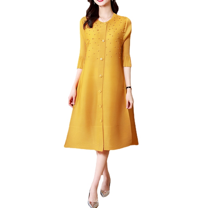 Creatingtime Printing Pleated Dresses For Women Stand Collar Long Sleeve Buttons Lace Loose Clothing Summer LH449