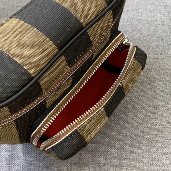 Small belt bag with zip fastening. Front zip pocket and internal mesh pocket. Adjustable belt. Made of jacquard fabric with iconic brown Pequin striped motif. Fendi Label appliqué in printed leather with gold lettering. Palladium-finish metalware.