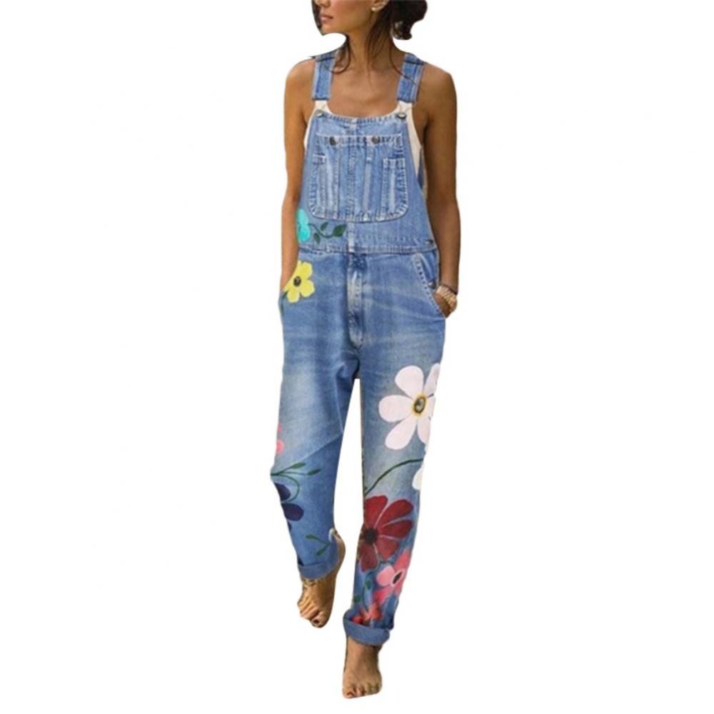 Women Floral Print Pockets Washable Denim Overall Jumpsuit Suspender Trousers