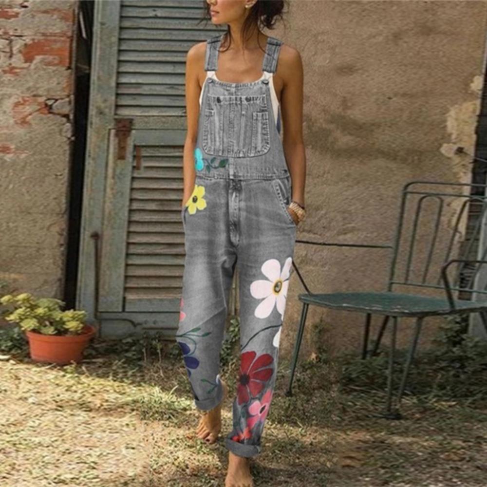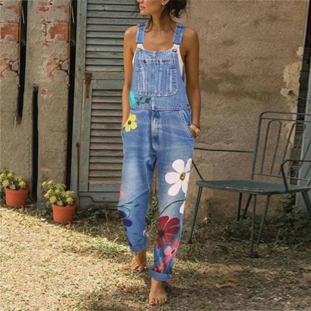 Women Floral Print Pockets Washable Denim Overall Jumpsuit Suspender Trousers