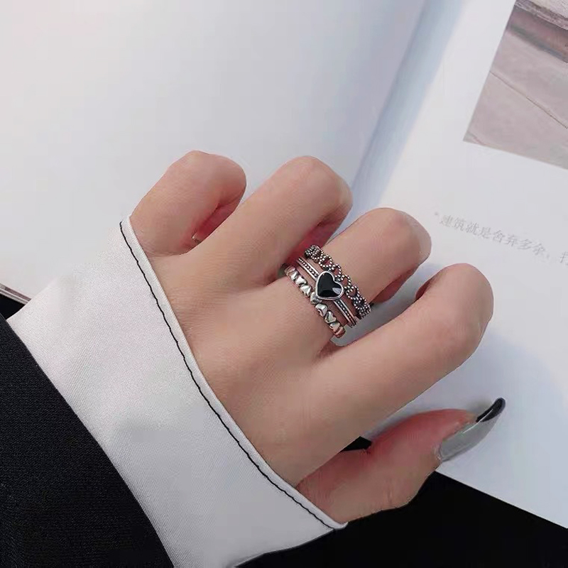 Goods : Korean ins trendy heart-shaped combination ring for men and women personality simple black love hollowed out adjustable