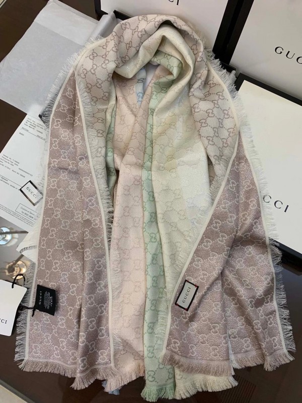 An evolution of the original Gucci rhombi design, the GG logo has become an established symbol of Gucci’s heritage. Integrated within the Cruise 2019 collection, the distinctive pattern is reimagined in combination with a multicolored pastel pattern. It is crafted from a blend of viscose, cotton, silk and wool for an accessory that feels supremely soft to the touch and is lightweight to wear.