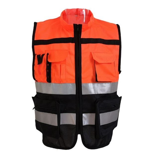 High Visibility Zipper Front Safety Vest With Reflective Strips Bicycle and Motorcycle Riding Safety Clothing Multi-Pockets