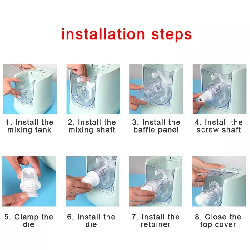 Features: *Multiple knife mold combinations can make wide noodles, narrow noodles, hollow noodles, dragon beard noodles, etc. ; * You can add egg liquid, vegetable juice (soft vegetable leaves can be put directly, hard vegetables must be juiced), etc. to make noodles of different flavors, healthy and delicious; * Simple operation, put the flour into the noodles, easy Get it done; *Food grade material, hygienic, healthy, environmentally friendly, and practical; *Imitate artificial kneading, add appropriate amount of flour, the machine will automatically mix the flour and water; *Excess dough can be easily cleaned by hand, simple and convenient; *Multiple safety protection The device has a long service life.