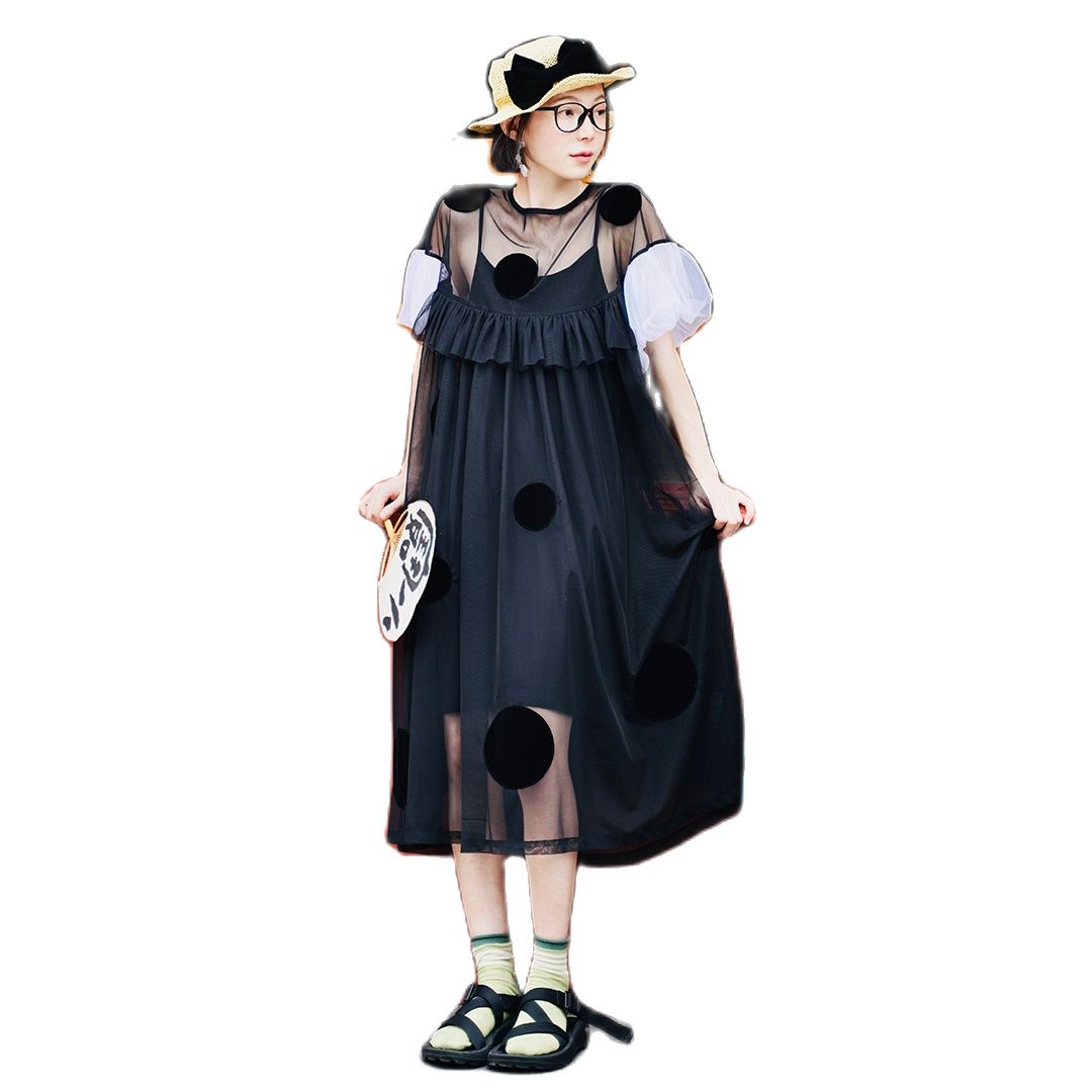 Imakokoni Original Summer polka dot patchwork gauze skirt Dress with loose bubble sleeves for Women 223771