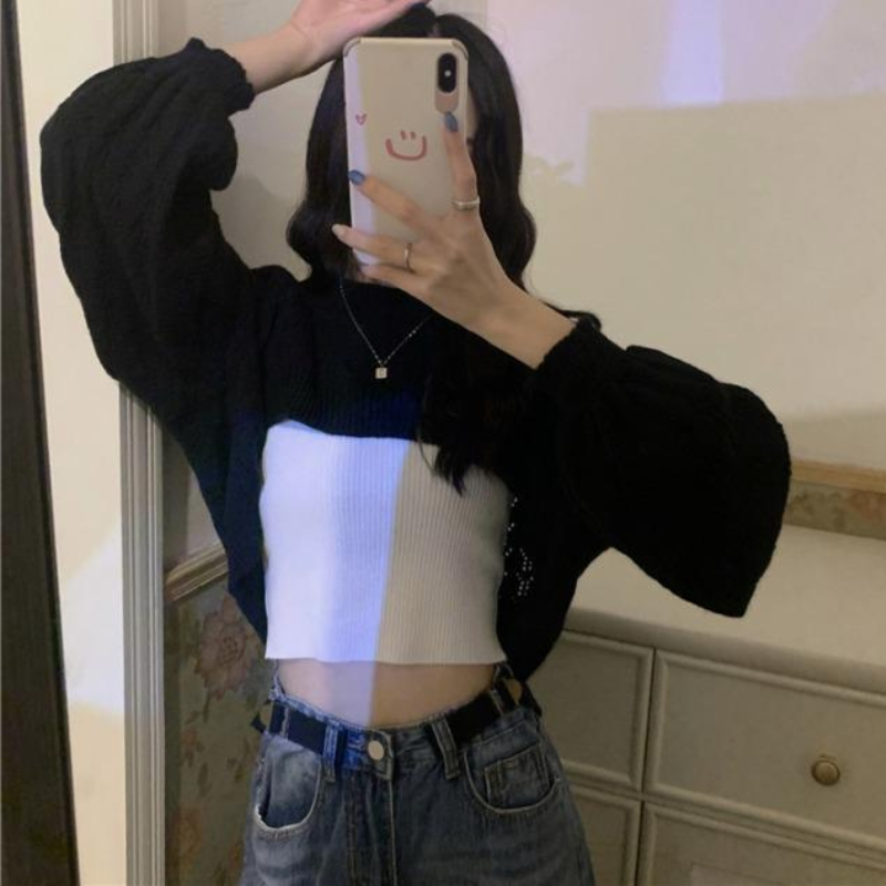 Knitted Shrugs Women Solid Loose Crop Top Hollow Out Designer Hipster New-arrival Soft Teenagers Full Sleeve All-match Ulzzang