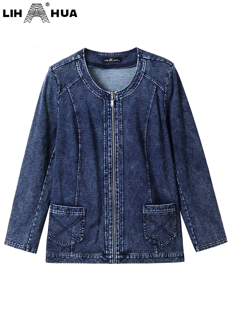 LIH HUA Women's Plus Size Denim Jacket Fall Casual Zipper Jacket High Stretch Cotton Knitted Denim