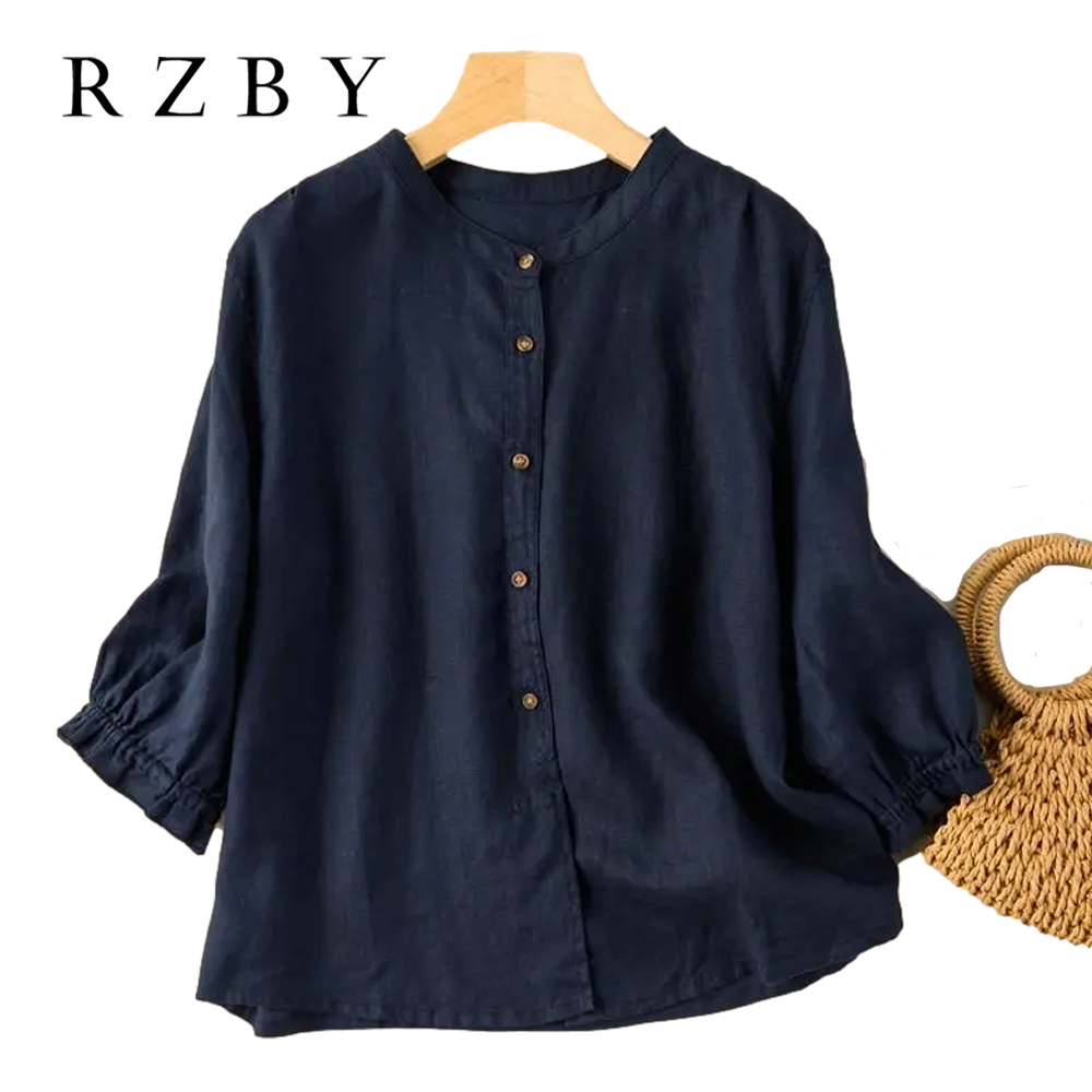 Linen Cotton Puff Sleeve Summer Shirts Women Blouse Ladies Loose Vintage Tops Half Sleeve Female Clothing Casual RZBY469