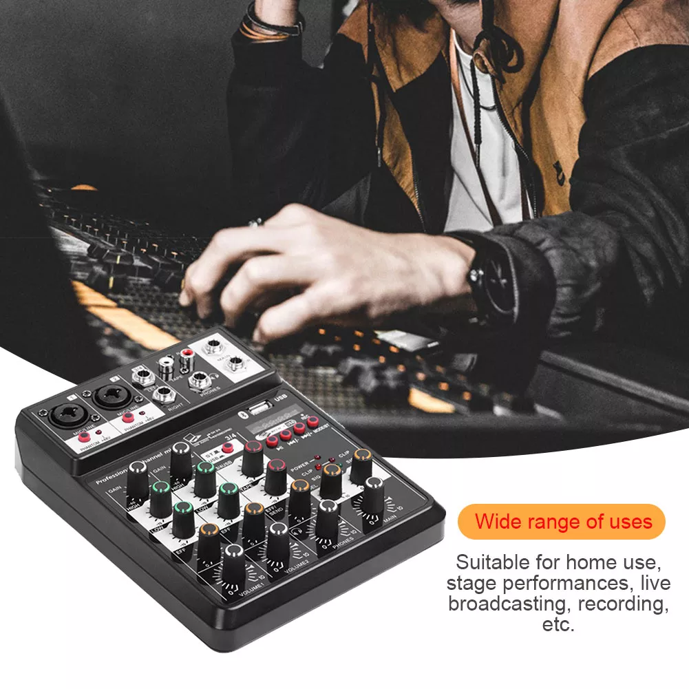 3. USB interface: This mixer has a USB port that can be connected to a computer and used as an audio output and input interface for playback and recording.