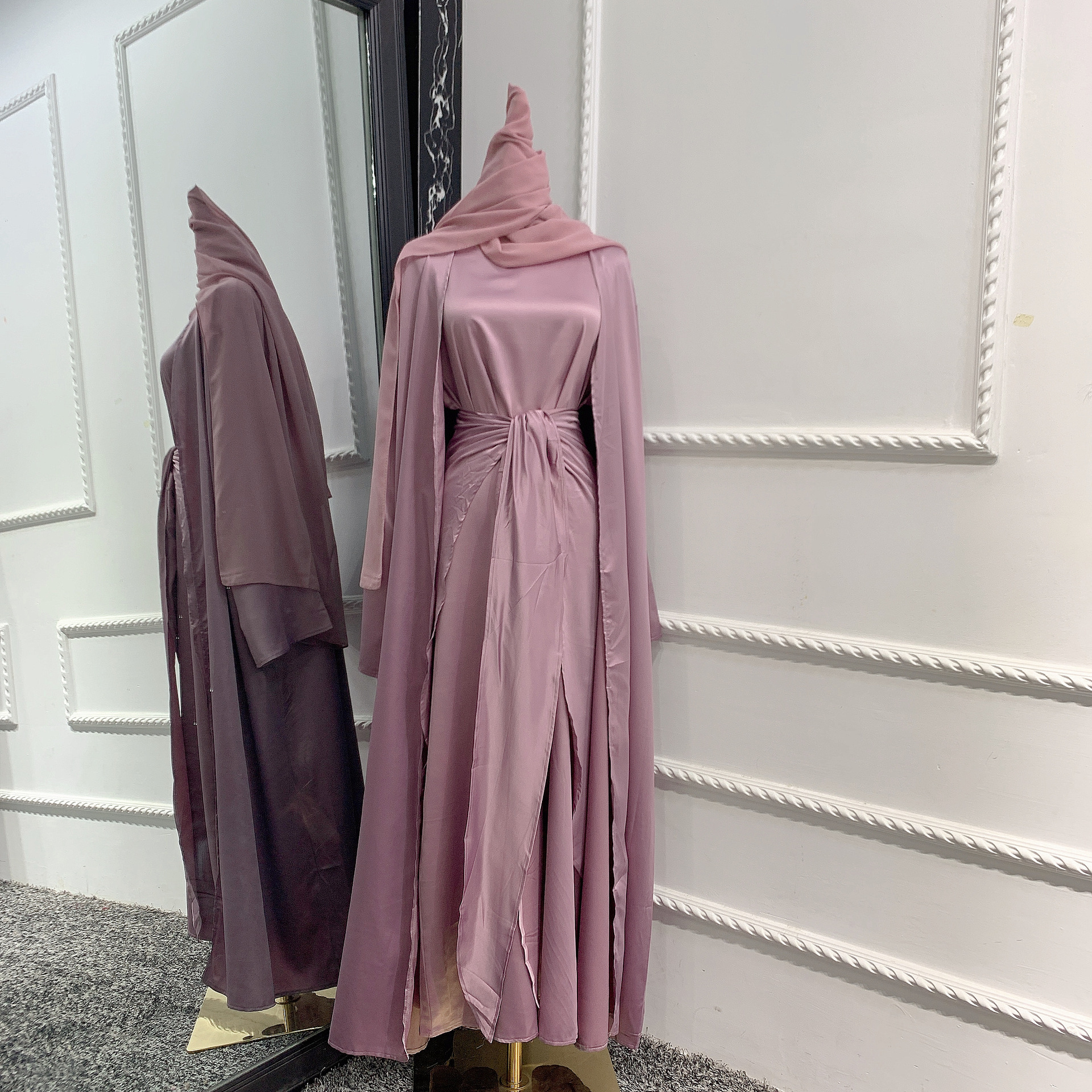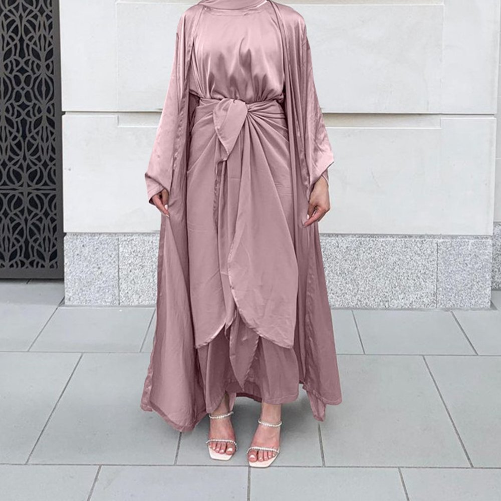 Muslim cardigan Kimono Women Hijab Dress Abaya Inner Robe with Wrap Tie Skirt Islam Clothing Dubai Turkey Kaftan Modest Outfit
