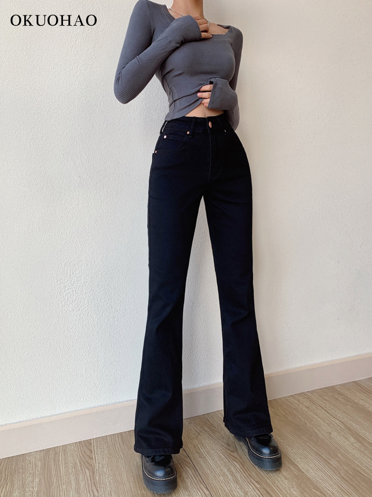 Okuohao Skinny Bell Bottom Jeans High Waist Stretch Straight Slim Fit Flared Denim Pants Casual Wash Black Y2k Trousers