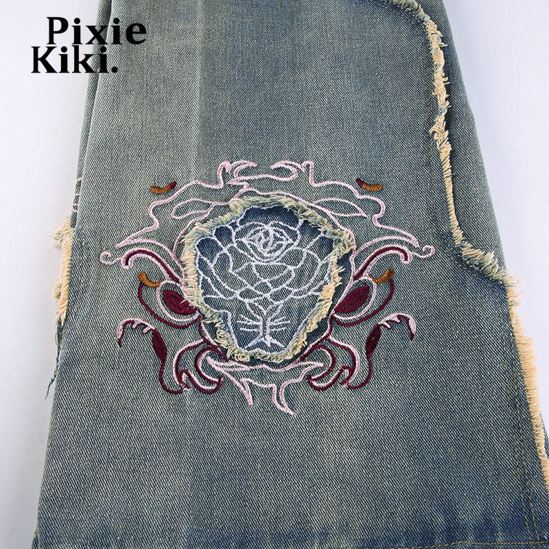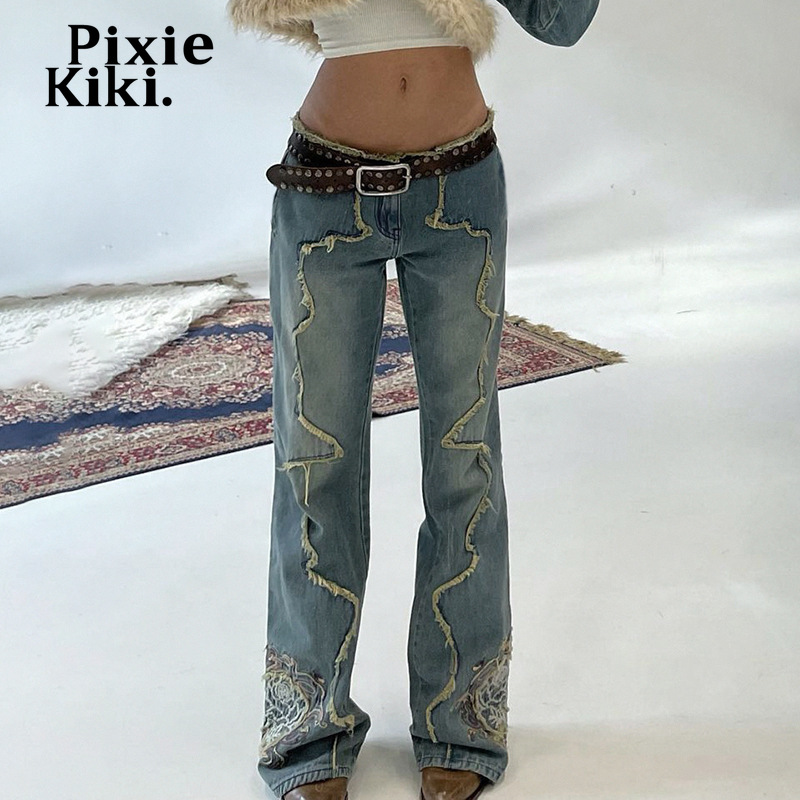 PixieKiki Y2k Embroidery Low Rise Flare Jeans Woman Streetwear 2000s Hippy Vintage Pants Women Denim Trousers P84-FF69