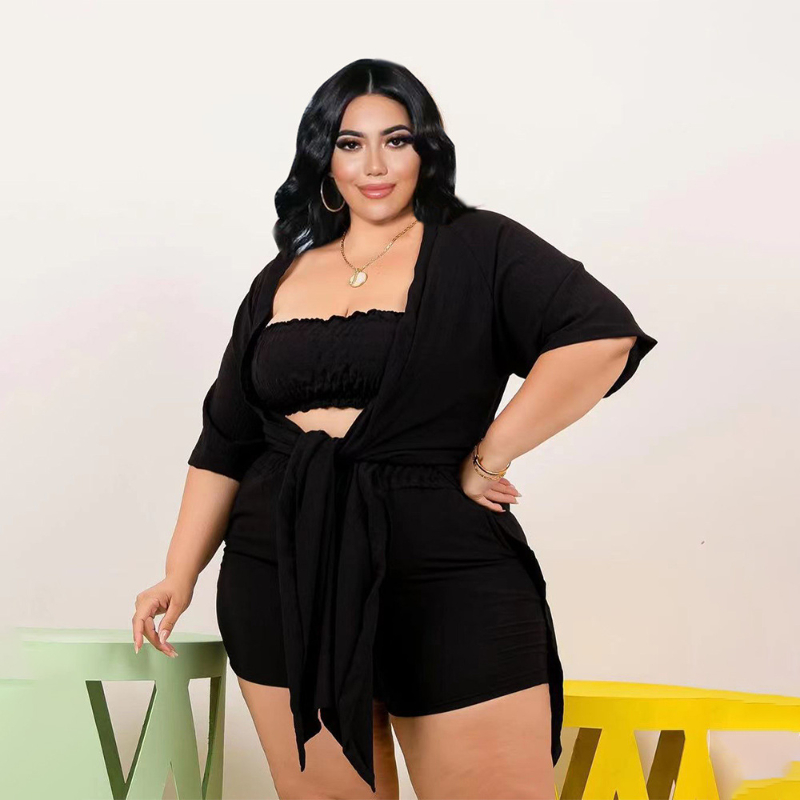 Plus Size Women Clothing Three Piece Set Sexy Wrap Crop Top Casual Lace Up Loose Coat Elastic Shorts Suit Ensemble Femme 5xl