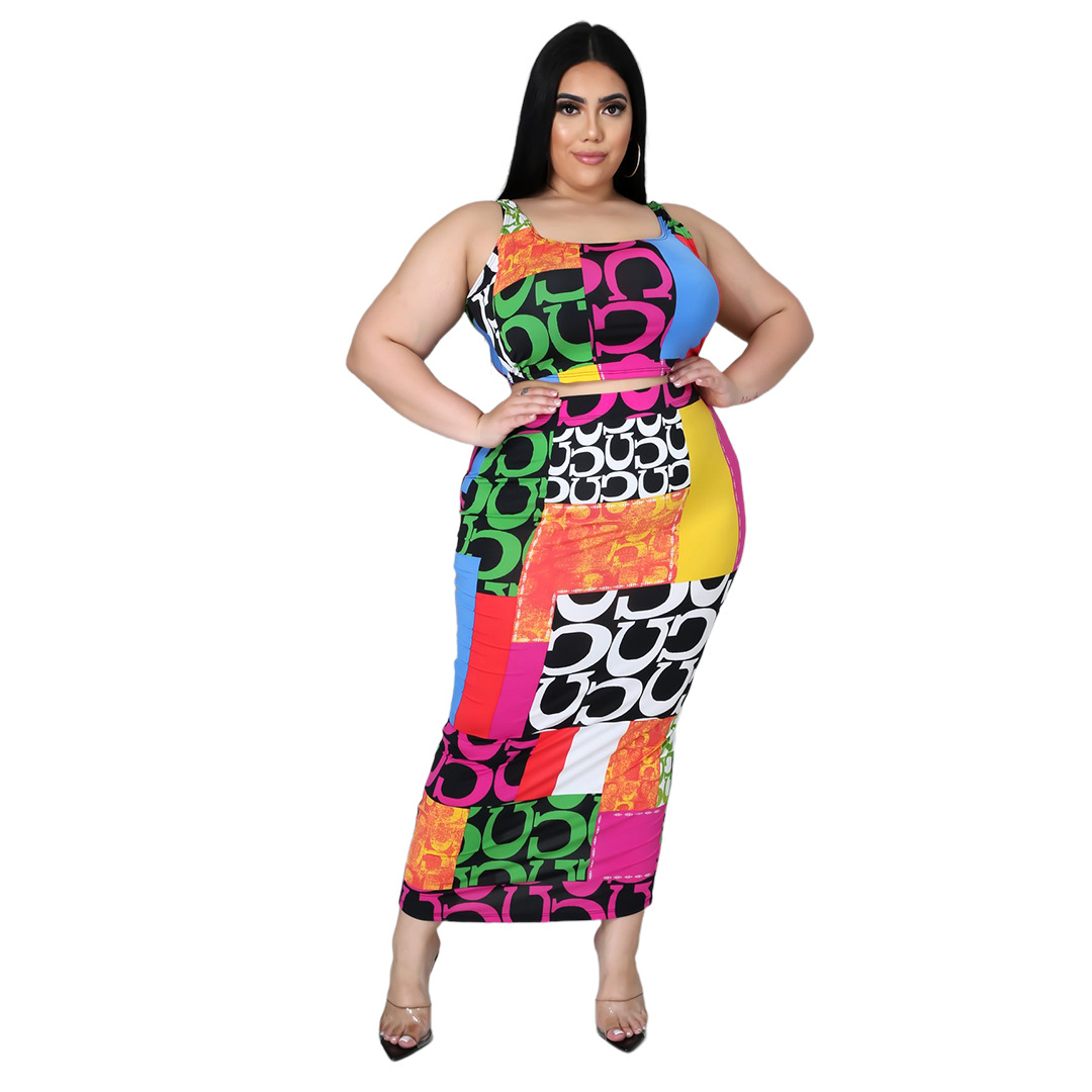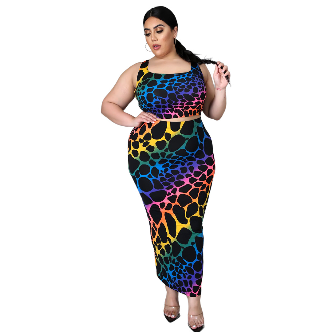 Plus Size Women Clothing Two Piece Set Summer Sleeveless Backless Crop Top Sexy Printing Skinny Dress Roupas Femininas Conjuntos