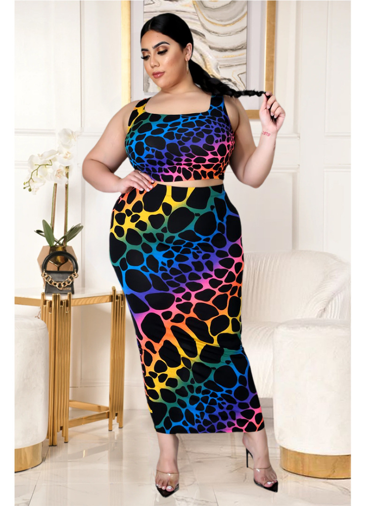 Plus Size Women Clothing Two Piece Set Summer Sleeveless Backless Crop Top Sexy Printing Skinny Dress Roupas Femininas Conjuntos