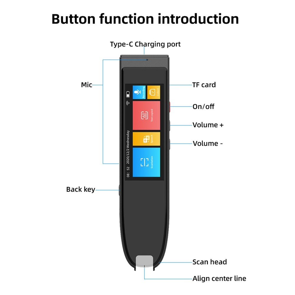 1,Scanning And Translation: This translator device can perform translation through text scanning, and quickly identify the translation in 0.5 seconds. Both flat and curved texts can be scanned and translated.
