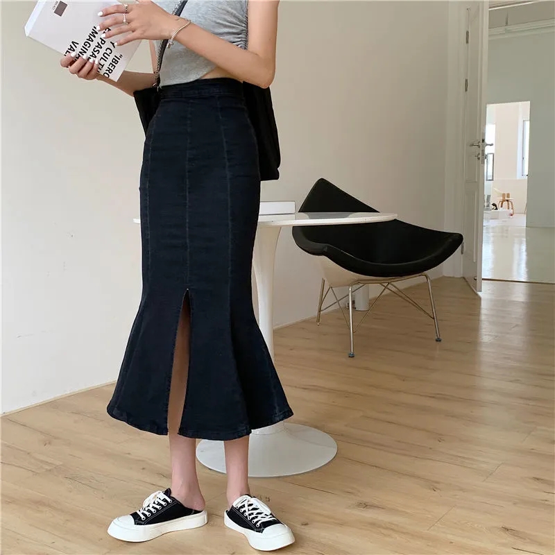 Sexy Vintage Splited Fork Hip-wrap Long Denim Trumpet Skirts Women's Summer Elegant High Waist Stretch Mermaid Skirt