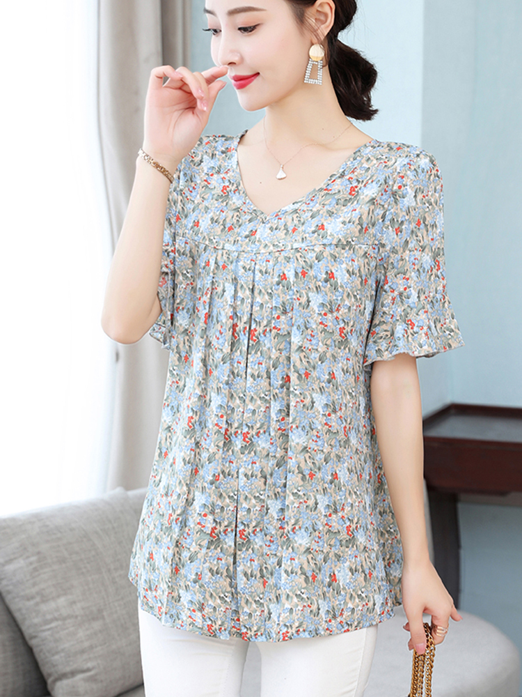 Summer Women's Tops Short Sleeved Ladies Blouse V-Neck Large Size Loose Top Chiffon Shirt Folds Casual Print Blouses Blusas