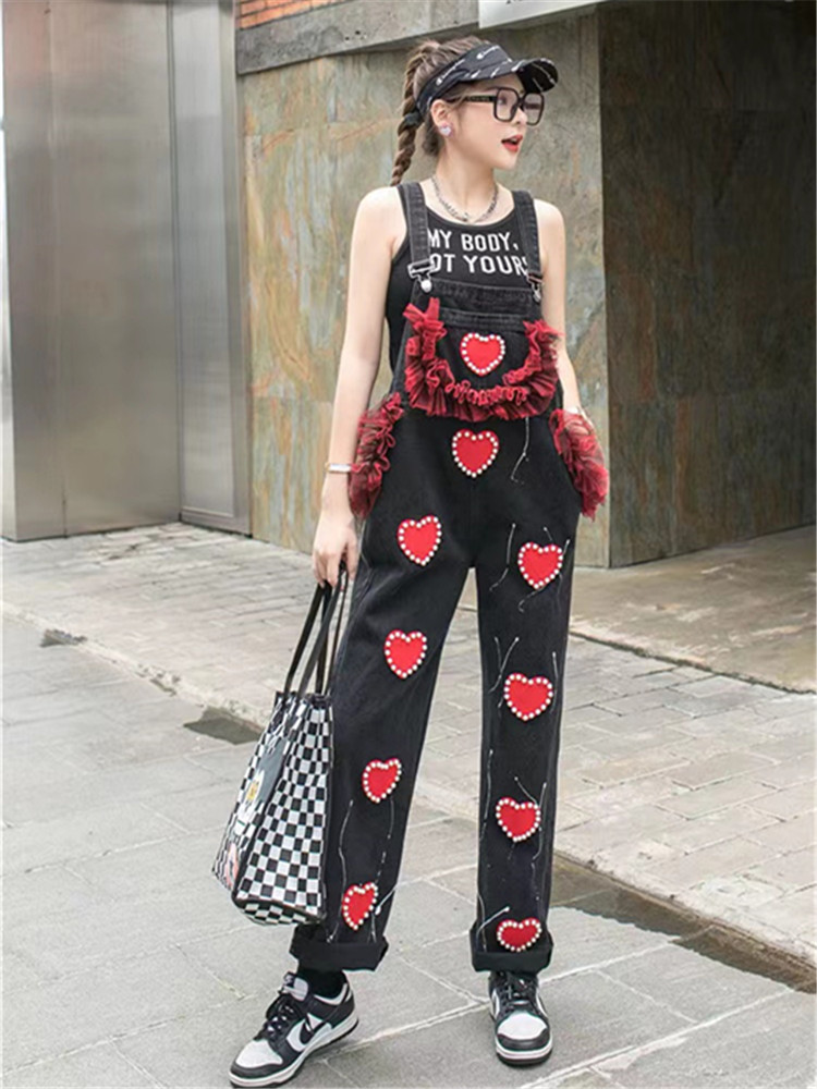 Tide able and foreign love beaded denim overalls women's unique loose mesh stitching sequin trousers