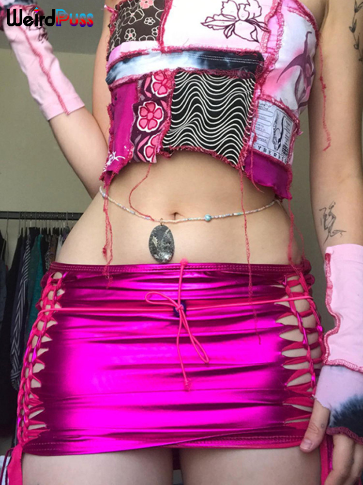 Weird Puss Y2K Hollow Mini Skirt Women Sexy Shirring Low Waist Girl Stretchy Skinny Street Hipster Wild Coquette Clothing