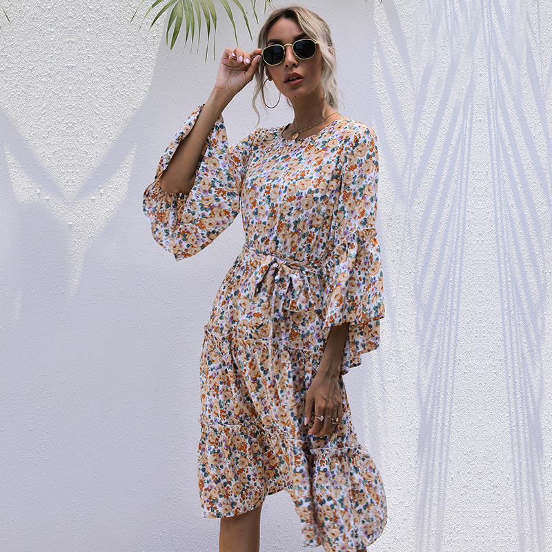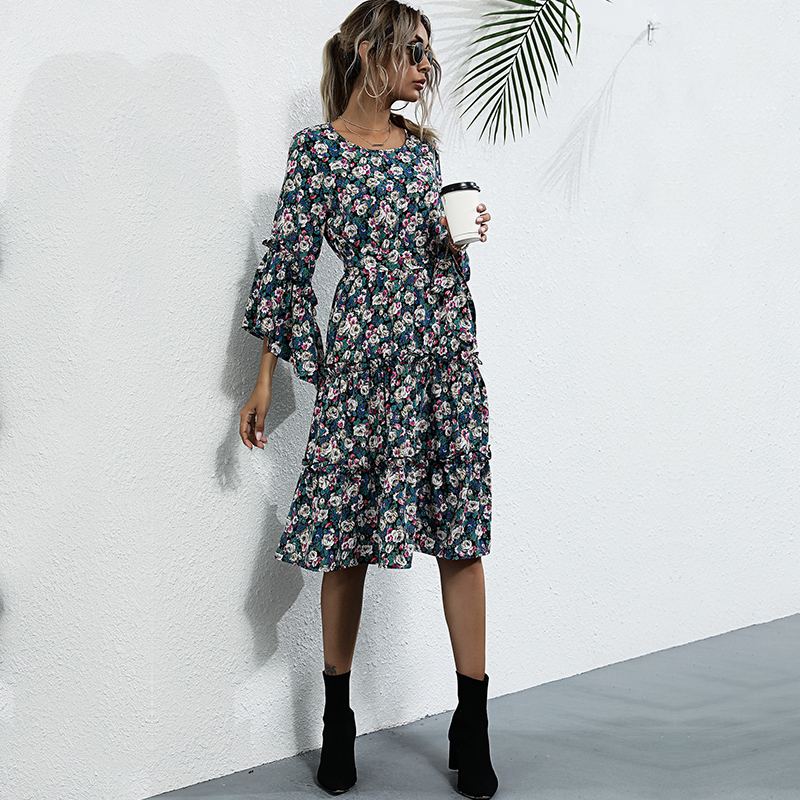 Women Elegant Cascade Ruffled Midi Dress Autumn O Neck Commute OL Shirt Dress Female Casual Holiday Dress Floral Dress