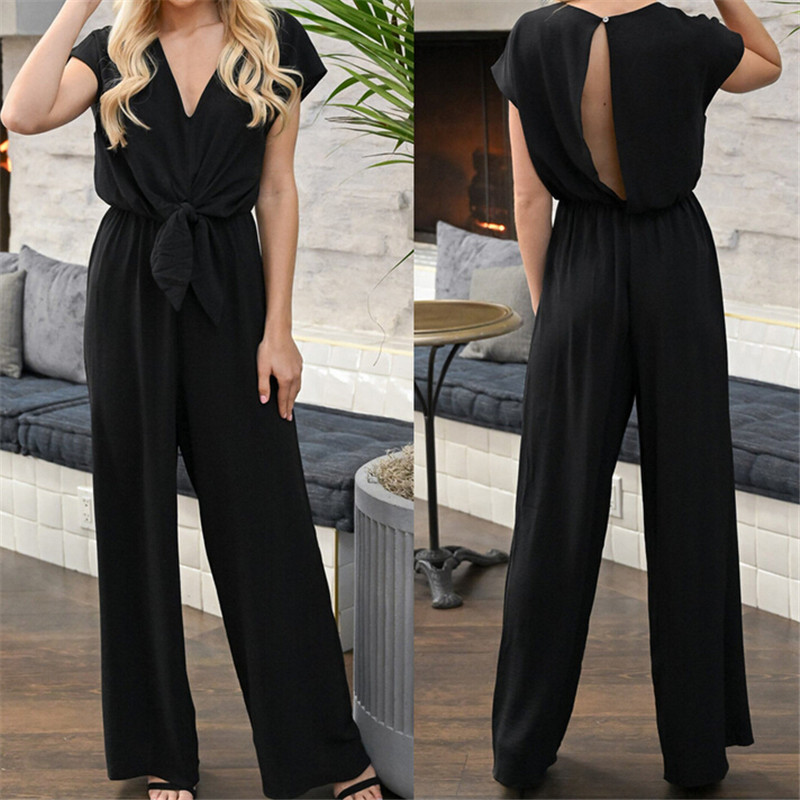 Women Short Sleeve Jumpsuit Solid Color Wide Legs Bodycon Jumpsuit  Simple Romper Trousers Club Wear 2019 V-neck Summer Playsuit!