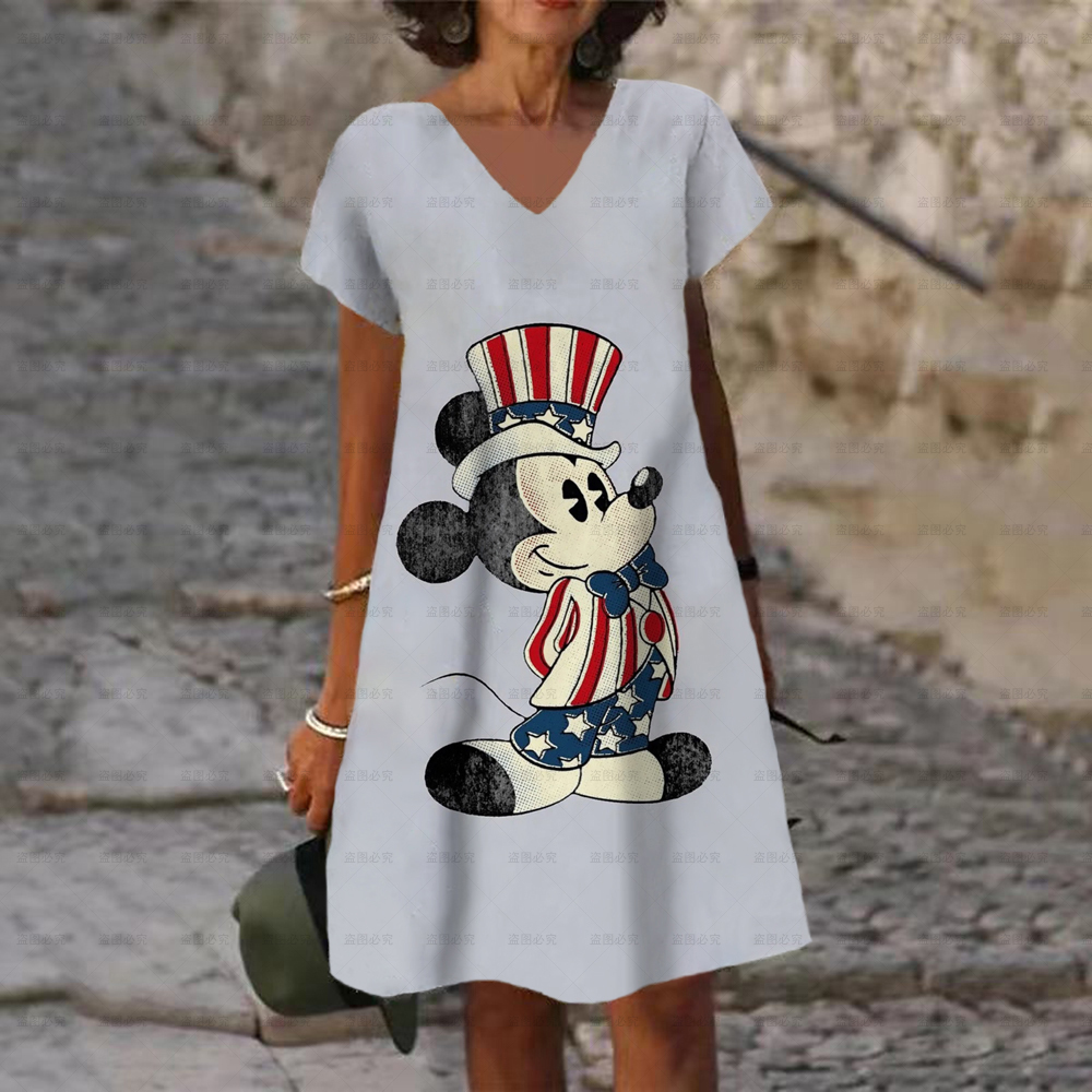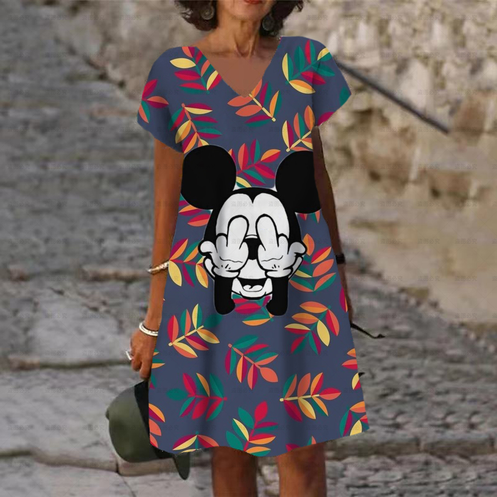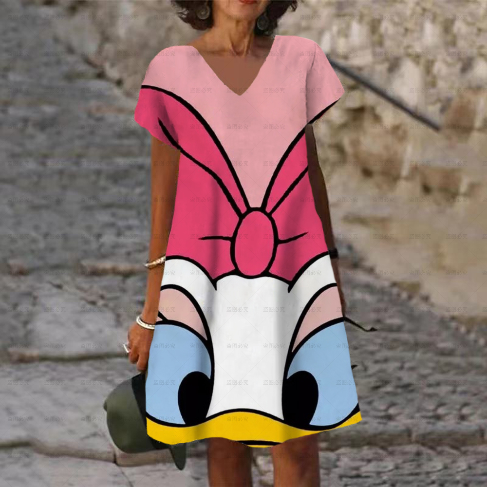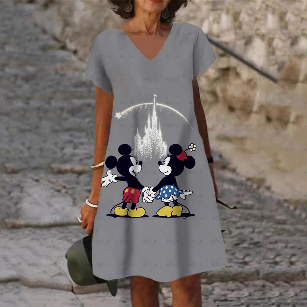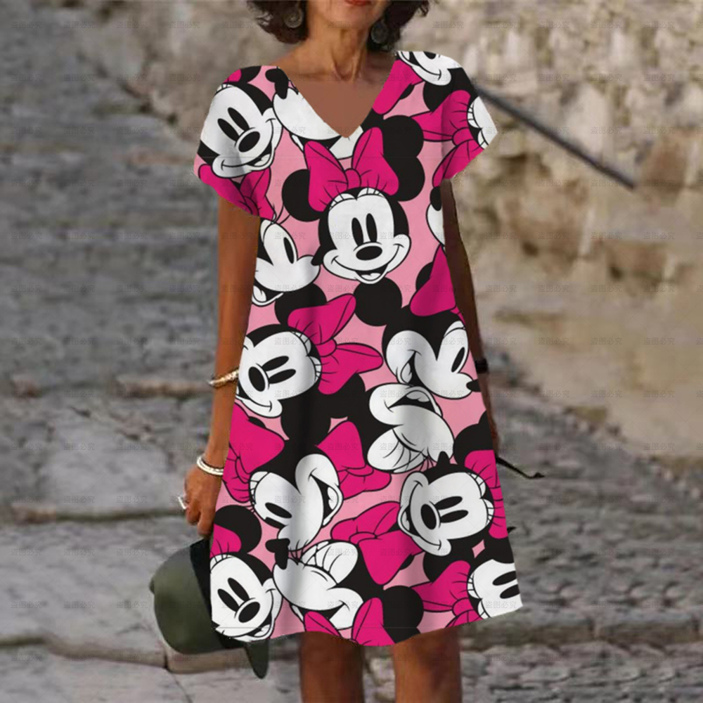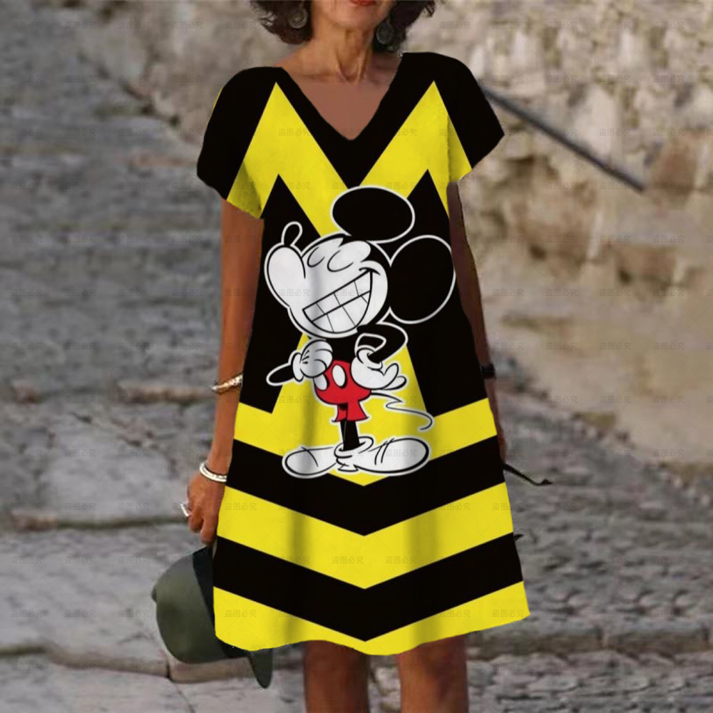 Women's Dress V Neck Casual Loose Dress Disney Mickey and Minnie Print Short Sleeve Knee Length Harajuku Dress