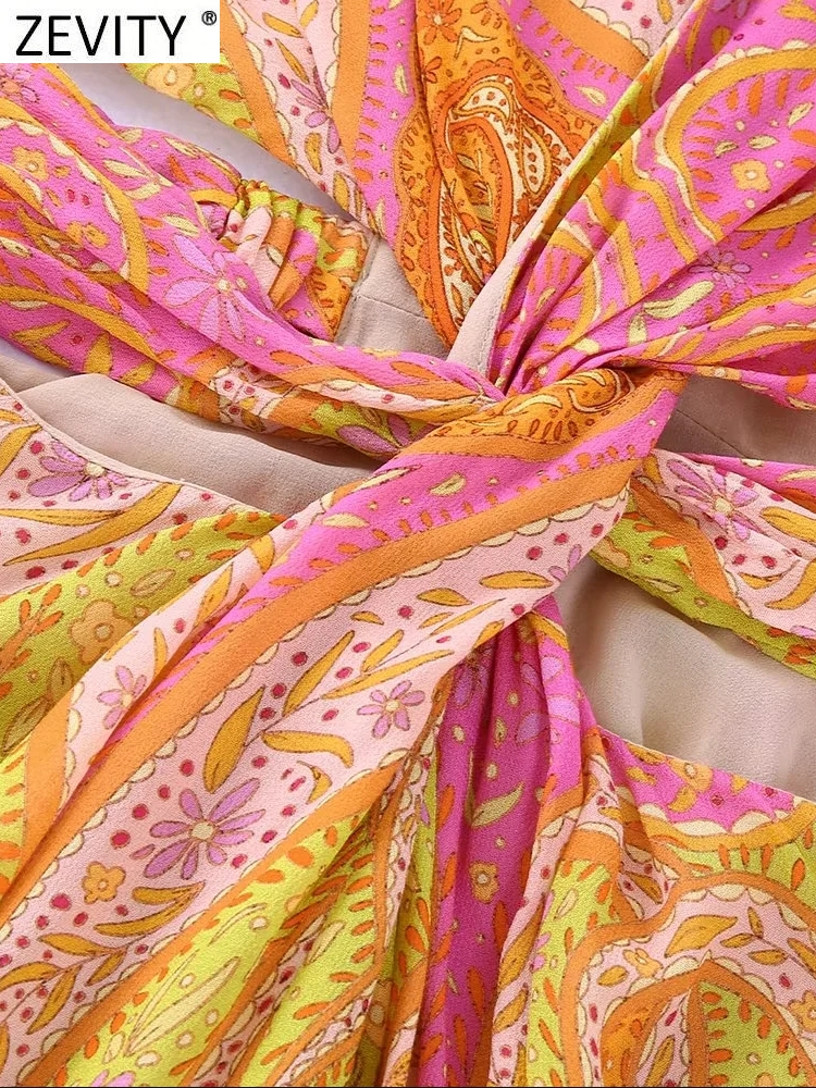 Zevity Women Vintage V Neck Cashew Nuts Floral Print Chiffon Mini Dress Female Chic Long Sleeve Twist Hollow Out Vestidos DS1845