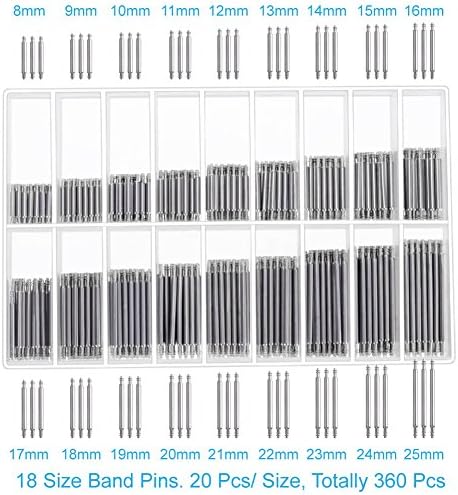 Anezus watch tools with watch link removal tool and watch pins are solidly made. The watch kit link remover with 6 replacement tips is handy and easy to use. The whole watch pin tools are great for removing watch bands, changing watch straps, replacing watch bracelets, repairing watches and fixing jewelry. Spring bars tool: Material: stainless steel Quantity: 1 piece spring bar pin tool with extra 6 tips for replacement Color: silver Sizes: 5 3/8” x 5/16” in L & W Handle: heavy hurl handle for a sure grip. Use: large fork end on spring bar removal for strap and rubber diver band; Small fork end for removing lug spring bars from backside of metal band. Fit for: any brand watches. Spring bar pins: Material: stainless steel Quantity: 360 pieces Color: silver Sizes: 8 mm, 9 mm, 10 mm, 11 mm, 12 mm, 13 mm, 14 mm, 15 mm, 16 mm, 17 mm, 18 mm, 19 mm, 20 mm, 21 mm, 22 mm, 23 mm, 24 mm, 25 mm. 20 pieces for each size Package: place in a plastic slot box with size information on it Package Includes: - 1 x Spring bar tool - 6 x extra tips - 360 x watch pins - 1 x glasses cloth - 1 x plastic container case
