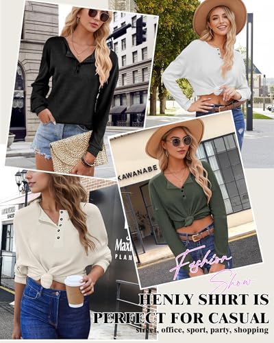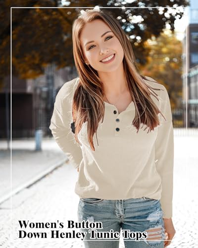 AURUZA Long Sleeve Shirts for Women Henley Shirts Waffle Knit Tops Casual Loose V Neck Tunic Tops Fall Outfits Waffle TShirt