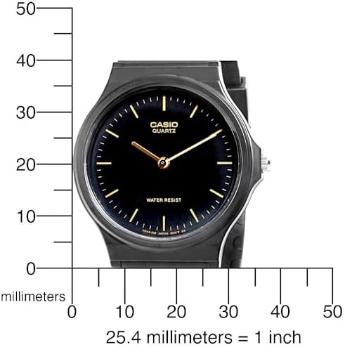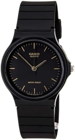 The basic black-and-gold design of the Casio Men's Analog Watch makes it a simple, versatile timepiece great for everyday wear. The watch is constructed with a resin case, a black stationary resin bezel, and a comfortable black rubber bracelet with an adjustable buckle clasp. A durable mineral window protects the black dial face, which cleanly features gold-tone hour indexes, gold-tone minute markers, and complementary watch hands.