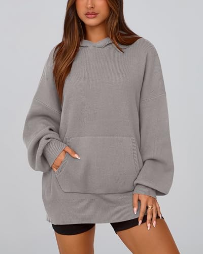 dowerme Women Oversized Sweaters 2024 Lantern Long Sleeve Drop Shoulder Chunky Knit Hooded Pullover Sweater With Pocket
