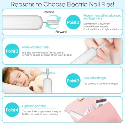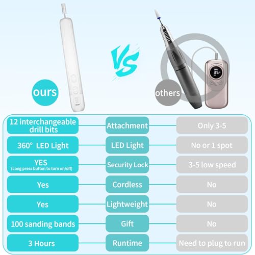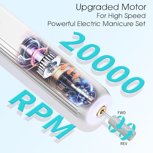 Professional Manicure and Pedicure Set: This electric nail file is design for hand and foot care, can be used for all-around shaping, buffing, grinding, polishing, cuticle, hard skin, callus removing. perfect manicure kit for women trimming, grinding and polishing natural nails and toe nail grinder kit for thick nails. You will enjoy this manicure pedicure tool kits !!! 360°LED light & Cordless & Portable: If you tired of messy cords and heavy Power Machine, Then your search stop !!! Hoxida Cordless nail dril machine is lightweight, and portable with you wherever you go, professional nail file with 360°LED light, provide you a surrounded clearer view of your grinding area, more efficient and professional for manicure and pedicure home salon use, or travel , you can do a spa hand and foot care experience at anytime anywhere you want. RECHARGEABLE Nail File : With a large battery capacity (2000mAh) battery, you can use this Electric nail drill machine to do hand and foot care at anywhere anytime. Type C USB Cable included , Being fully charged this for about 3hours, the electric nail file will work up to 3 hours. Easy to use, Even for Beginner: This electric manicure pedicure kit have 3 adjustable speed 0-20,000rpm and designed with forward and reverse rotation directions,choose the appropriate speed and rotation for your needs; ergonomic body design for comfortable holding, speed and direction controlling. Easy to use, enjoy a salon-quality professional manicure pedicure at home. EVEN BEGINNERS CAN USE THIS ELECTRIC NAIL FILE WITH EASE ! Low Noise, Low Heat : Hoxida manicure and pedicure tools kit is built to last, with a powerful yet quiet motor with smart heat dissipation, keep the pedicure drill machine is in low noise, low heat while using it. a perfect home pedicure manicure kit for doing your own mani and pedi. What you will get: The Electric Nail Drill Kit comes with 12 interchangeable drill bits,100 sanding bands , dust shield and Type-C charging cable to give your nails a salon-worthy look, this nail kits are the best gift for your nail lovers friends, It's so convenient and you can do a hand or foot care salon privately at home, and everything you need is included.