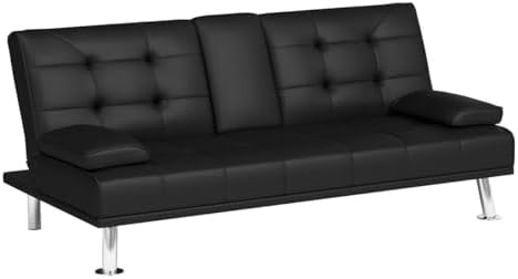 You get what you pay for with this couch. We bought it for my son’s 13th birthday for his room. It’s fairly small and sits low, was a perfect size for under his loft bed. It’s fairly firm and creaks when you sit on it. The cup holder section is connected by a piece of fabric so it can shift around a bit when it’s down. The “arm rests” are just very thin pillows that fall off the couch when you move. It’s very easy to put down into bed mode and back up into a couch position. My son loves it and don’t mind the firmness or noise it makes. For the cost, it’s a fairly decent item.