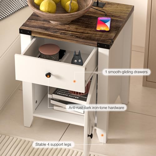 GAZHOME End Table with Fast USB Charging Station, 24” Tall Sofa Side Table with Drawer, Large Storage Rustic Wood Square Storage Cabinet for Living Room,Bedroom,Office, White