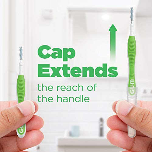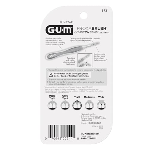 Go beyond brushing with GUM Proxabrush Go-Betweens. Between-teeth cleaning is essential for removing plaque from hard-to-reach areas that are missed by brushing alone....But tight teeth, difficulty gripping floss, and a simple lack of time prevent many of us from flossing as often as we should. Proxabrush Go-Betweens Interdental Cleaners are clinically designed by dental professionals to offer a quick, easy, and effective alternative to flossing. Our Tight reusable floss brushes are specifically made to remove plaque and food particles from tighter interdental spaces, the perfect braces cleaner. Each floss brush features coated bristles and a breathable travel cap that allows for up to ten days of use. With GUM Proxabrush Go-Betweens, cleaning the hard-to-reach areas in your mouth has never been easier. A non-slip rubber handle and bendable neck make it easy to maneuver to the back of the mouth while nylon coated wire cleans around braces, bridges, implants, and other dental devices without the risk of scratching or galvanic shock. Features : ● Designed for tight interdental spaces ● Triangular bristles for 25% more effective plaque removal* ● Nylon coated wire is a perfect braces brush for cleaning. ● Coated bristles and a breathable travel cap allow 10 days of use ● Non-slip rubber handle for easy grip ● Bendable neck for further reach Our dental brushes make it easy to carry a confident smile with you wherever you go. Different from flosser picks, each interdental brush features a compact, portable size that fits easily into purses, pockets, and travel kits for healthier gums, cleaner teeth, and fresher breath anytime, anywhere. *vs DOF-0001