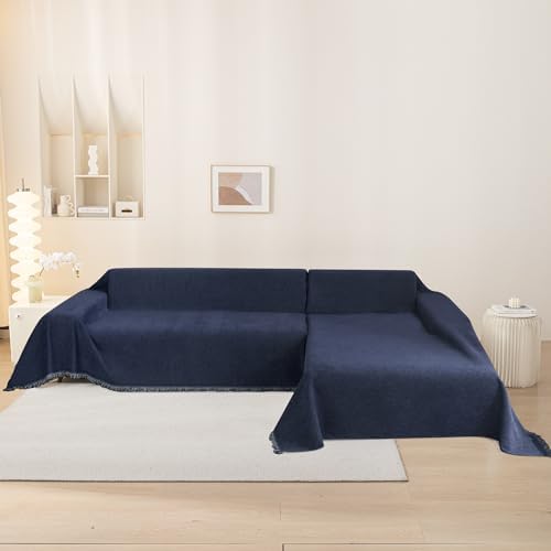 Loving this couch cover! We are a dog-loving household, and our boisterous GSD/Staffie mix pretty much uses our leather couch as her daybed. She does not go easy on this cover, and yet it's holding up perfectly! It's a perfect weight and weave, as it breathes but doesn't let her daily dirt through. I bought the largest size in brown for my ~80" couch, and it's plenty of coverage and doesn't require constant repositioning/adjusting. The cover has a slight fine courdoroy-/chenille-like texture to it that's quite nice and soft. I plan to order the navy color one as backup soon for wash days. Hope this description helps!