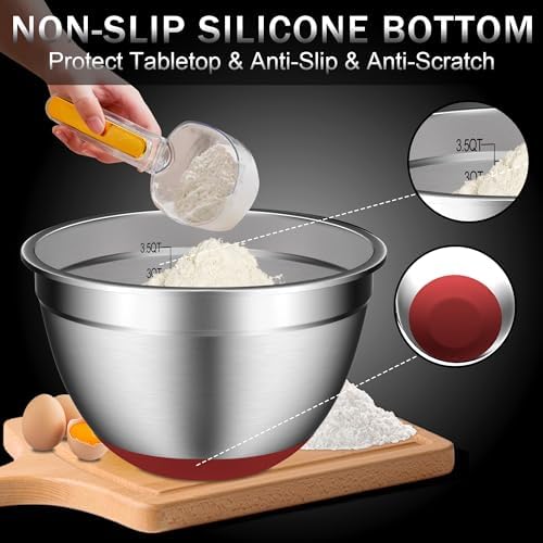 Umite Chef Mixing Bowls with Airtight Lids, 6 Piece Stainless Steel Metal Bowls, Measurement Marks & Colorful Non-Slip Bottoms Size 7, 3.5, 2.5, 2.0,1.5, 1QT, Great for Mixing & Serving