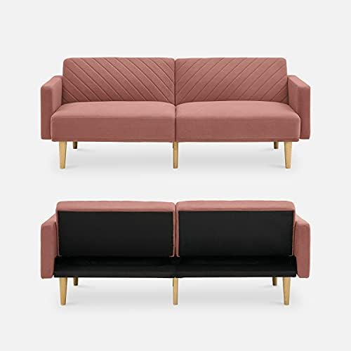 I love this sofa! For the price I paid ($279) it’s a great value and amazing quality. It took less than 10 minutes to put together, the cushions are firm but soft and the fabric is beautiful. Fits wonderfully in my apartment and pairs well with my mid century modern look. I’m5’4 and can comfortably lay down on it and its perfect for a guest bed. Would recommend and would buy again!