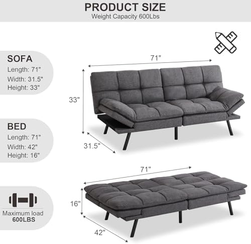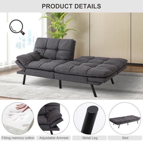 MUUEGM Futon Sofa Bed Couch Convertible Futon Memory Foam Futon Couch Bed Modern Sofa Couch Love Seat Sleeper Sofa for Small Space,Living Room,Office,Adjustable Backrests&Armrests Sofabed,Dark Grey.