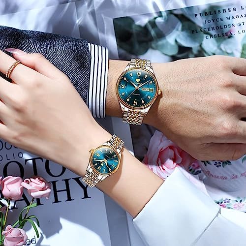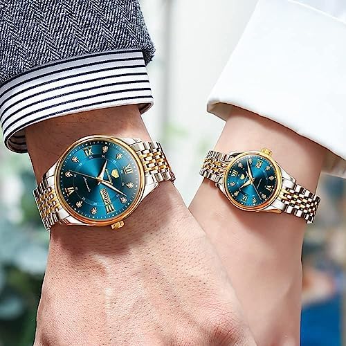 OLEVS Valentines Couple Pair Automatic Watches His and Her Couple Set Diamond Wrist Watch Men and Women Lovers Wedding Romantic Gifts Set of 2