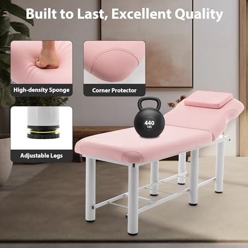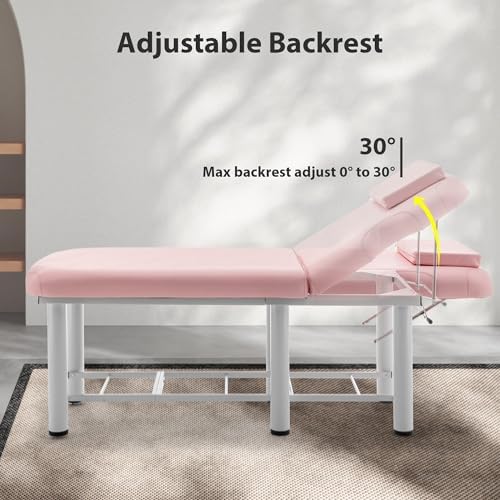 Professional Massage Table, PU Salon Lash Tattoo Bed with Adjustable Backrest, Removable Headrest, Bottom Shelf Storage, Beauty Barber Spa Equipment, Pink-3