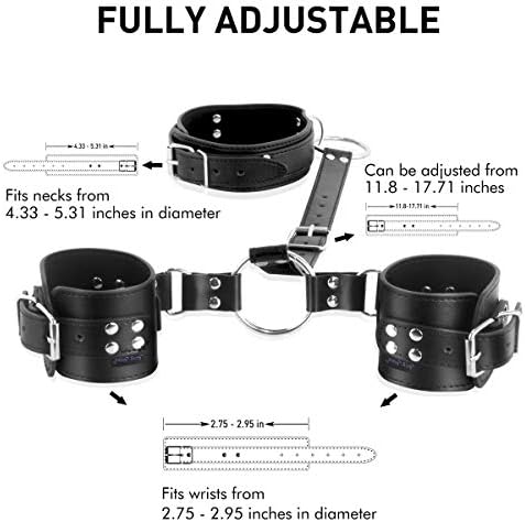 I wanted to use this a couple of times before submitting a review because not all restraints are created equal! This one attached from neck to wrist, and can be worn from the back as the picture shows, or from the front. The main leash length is adjustable as is the neck and wrists. Having small hands I have to use the restraints on the tightest, smallest setting but even still is comfortable as the inside of the restraints is lightly lined with a softer almost velvety material. I love the added studs to make it look extra edgy, and I love that it’s very easy to adjust even if you’re playing alone and don’t have anyone to help you. Some of the studs come all the way through the collar as shown in the photos, but I honestly haven’t been able to feel them.This is a great restraint for beginners as it’s very easy to attach the collar first and then fit the wrist restraints even by oneself. It loses a few points from being the ideal restraint however because it does get sweaty, and the inner lining material is soft but not the softest and most forgiving texture. However for an affordable set of restraints, these are awesome—no need to spend $100+ on a full leather restraint when this one is a very useful and comparable option.