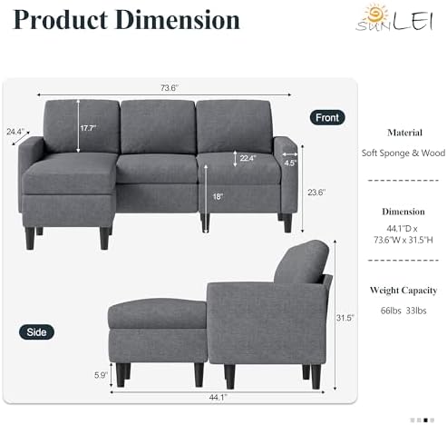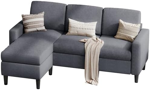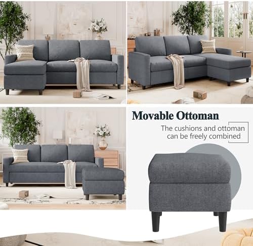 SUNLEI L-Shaped Couch Sofa for Living Room Convertible Sectional Sofa with Reversible Chaise Modern Linen Fabric,Sectional Sofa Couch for Small Space(Dark Grey)