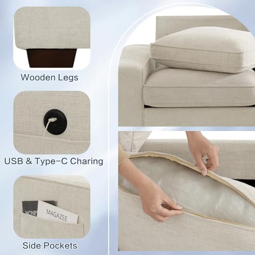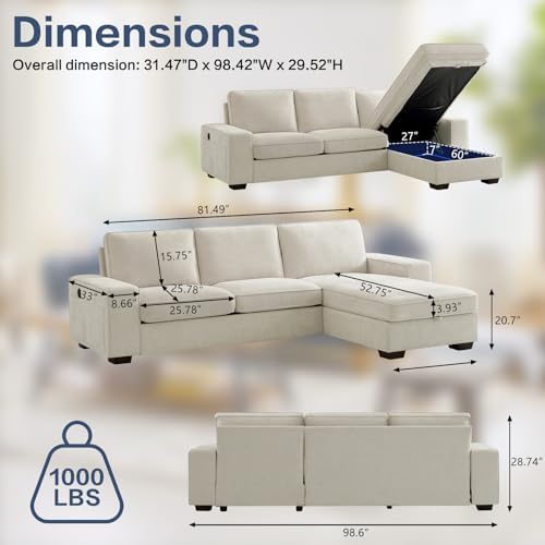TEKAMON 99" Convertible Sectional Sofa Couch with Chaise Storage, Modern L Shaped Reversible Couch for Living Room, Comfy Chenille Fabric Sofa, Removable Cushion Covers/USB Type-C Ports,Beige