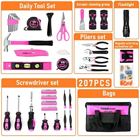 THINKWORK Pink Lady Tool Set Home Repairing Kit with Wide Mouth Open Storage Bag.