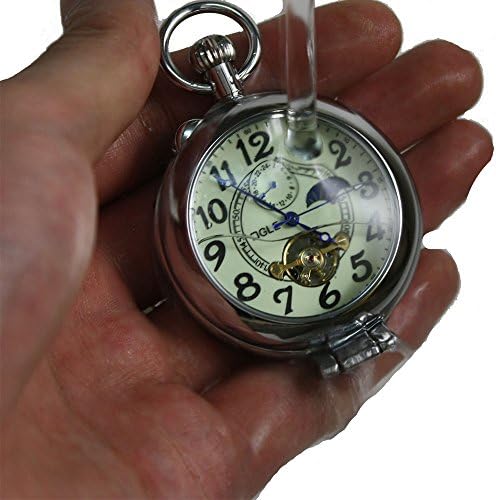 I loved the watch the minute I unboxed it and put it to work.Looks great at day time as glows in the dark.The magnifying glass not only enhances the face but can be used as a magnifying glass and as a stand on night table.I liked it so much that I upgraded it with an pure silver vest chain.The winding is very smooth to the touch...and so far keeps excellent time.The big numbers on the face plus the half moon indicting day and night have effective visibility.This without a doubt is a good quality pocket watch.RECOMMENDED