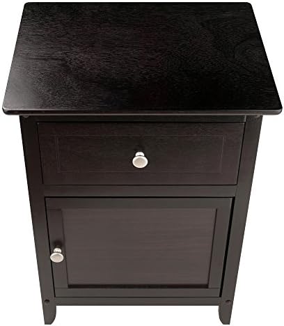Add extra table space to a living room, den or bedroom with the versatile and ageless design of the Winsome Wood Eugene Accent Table. Whether you decide to put your alarm, lamp or family photo, the clean and simple design of this table allows it to blend well with most home decor. This Winsome classic is finished in rich espresso and adorned with two satin nickel knobs for a sticking contrast of elegance. Featuring a small pull-out drawer for storing pens, notepads, remote control and small accessories, organized and out of sight. The bottom door opens up to more storage space. Keep photo albums accessible or some of your favorite night time storybooks within reach in the spacious compartment. For larger beds, sofas and/or rooms, try adding one accent table on each end (each sold separately).